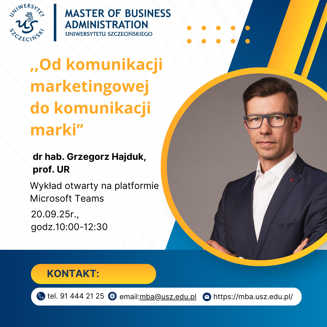 Informujemy, iż w dniu 20.09.2025 r. o godz. 10:00 (w formie ONLINE) odbędzie się wykład otwarty dr hab. Grzegorza Hajduka, prof. UR pt. „Od komunikacji marketingowej do komunikacji marki”. Wykład odbędzie się poprzez platformę Teams i nie wymaga zapisów. Zapraszamy Państwa do zapoznania się z sylwetką naszego gościa, którą przedstawiamy poniżej i udziału w wykładzie.